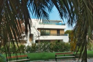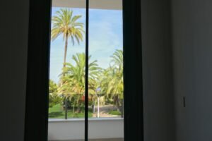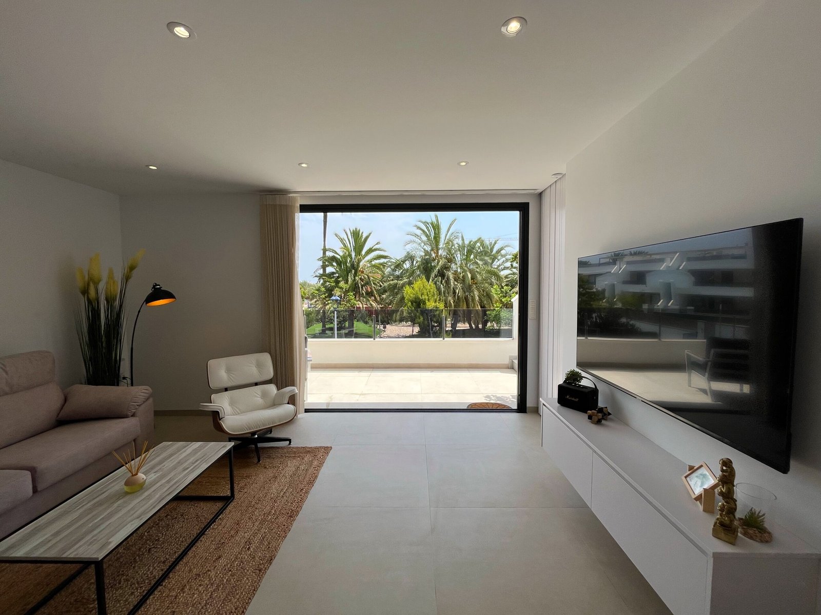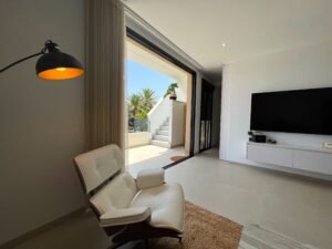 De woonkamer beschikt over grote glazen schuifdeuren die verdwijnen in de muur, waardoor een unieke verbinding ontstaat tussen de binnen- en buitenruimtes. Het terras met een prachtig uitzicht op de palmbomen wordt hierdoor bij de